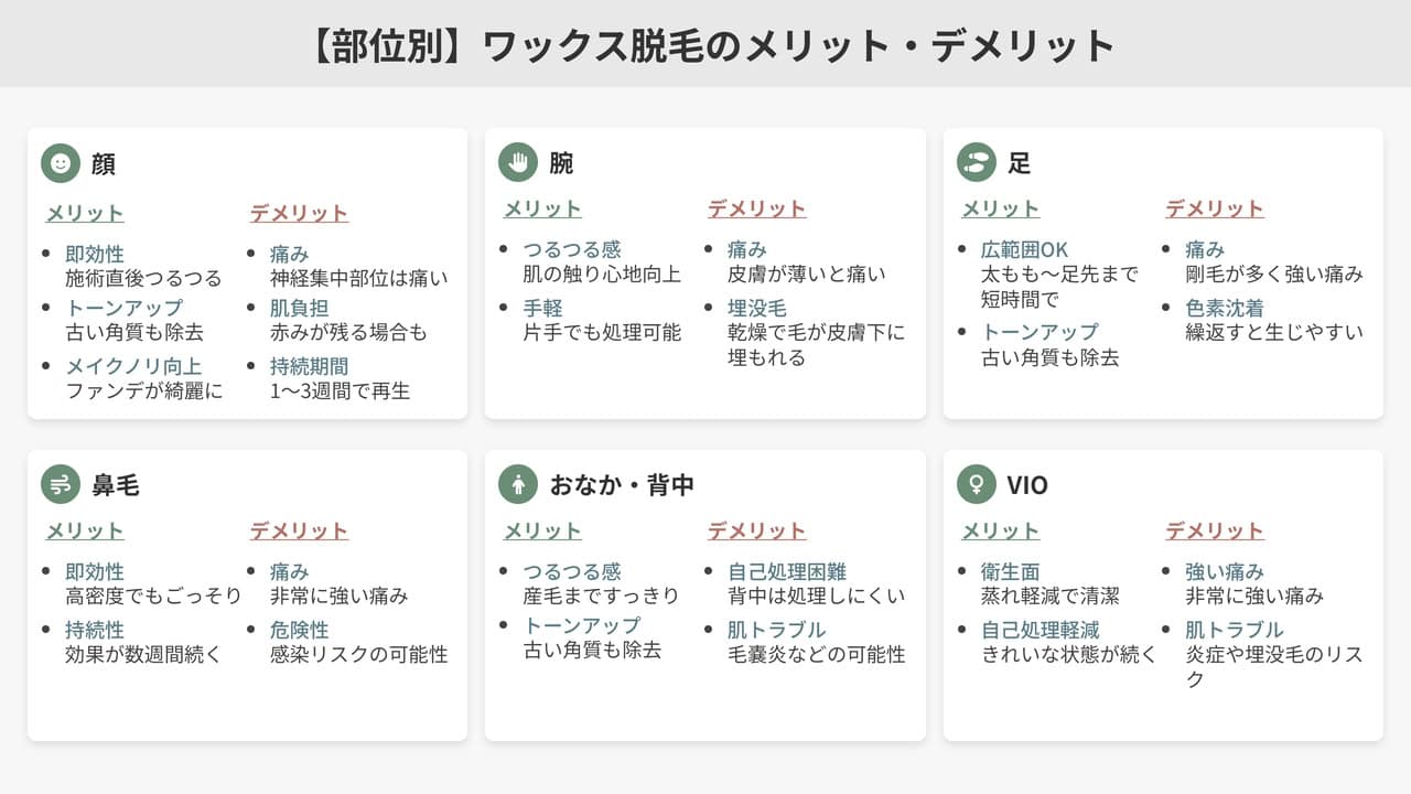 顔の皮膚は薄くレーザーやシェービングで刺激を受けやすい部位。ワックスは角質と一緒に産毛をオフし、毛先が丸く再生するためチクチク感が少ない利点があります。ただし正しい温度管理とアフターケアが必須です。