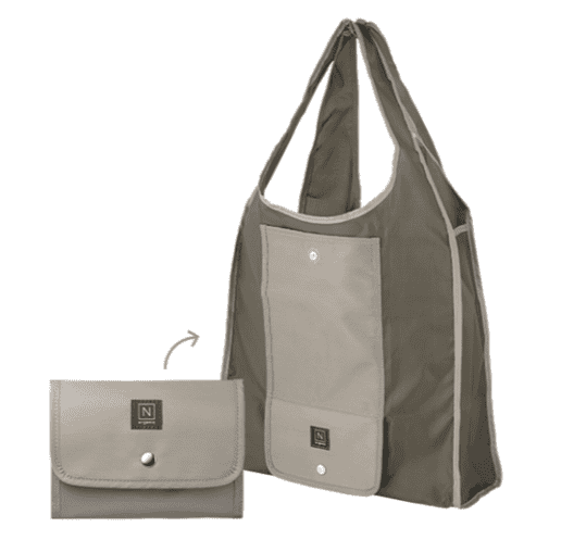 Nオーガニックから発売中のエコバックです。サイズはタテ33.5cmにヨコは34cmマチ付きで14cmの大容量。スナップボタンで折りたためてコンパクトに収納可能です。素材は水にも強いポリエステルで色は、ヨゴレが目立たずどんな服装にもマッチしやすいグレーカラー。素材は薄く感じて軽量なのに、荷物はたっぷり入ります。底がマチ付きなので、横倒しをしたくないボトルタイプのものも立てて持ち運べるエコバック。折りたためてコンパクトに持ち運びができるので、常にハンドバッグに入れてサブバッグとしての活用もOKです。
