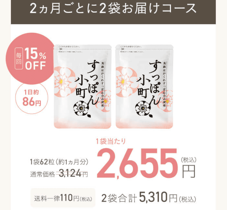 | 定期購入(毎月2袋) | 2,655円 | 15%オフ(469円おトク) | 1日約88円 |