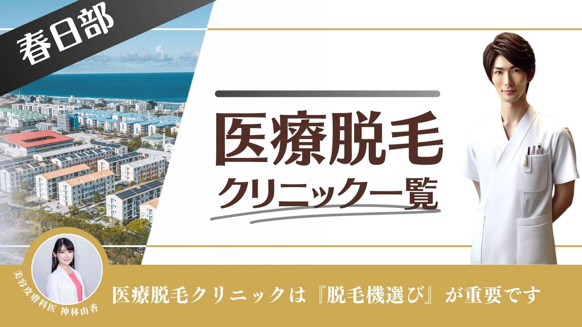 春日部で永久脱毛できるおすすめメンズ医療脱毛(レーザー脱毛)クリニックや美容皮膚科、使用されている脱毛機情報をご紹介します。男性の全身脱毛、VIO、ヒゲ、足の部位毎に安いクリニックや都度払い、予約方法や割引キャンペーンを比較できます。