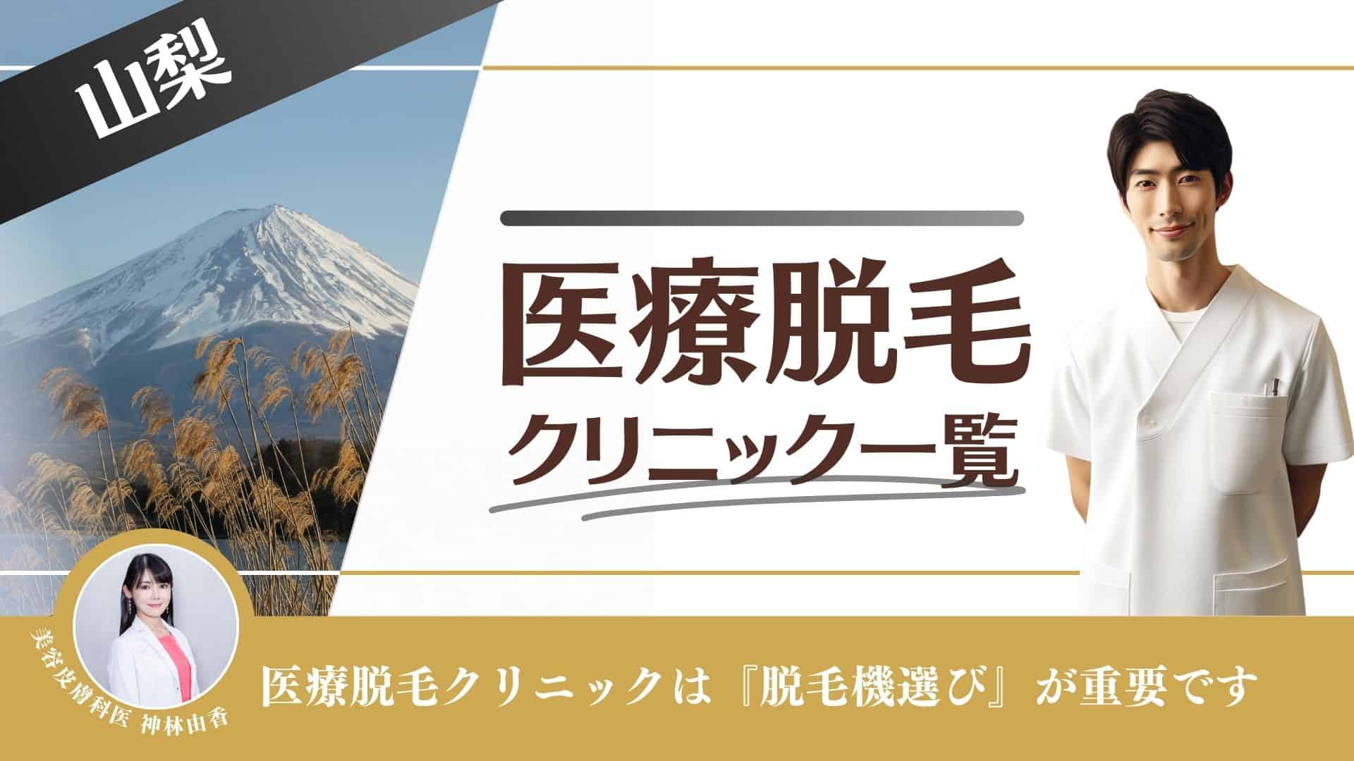 山梨で永久脱毛できるおすすめメンズ医療脱毛(レーザー脱毛)クリニックや美容皮膚科、人気ジェントルマックスプロなど使用されている脱毛機情報をご紹介します。男性の全身脱毛、VIO、ヒゲ、足など部位毎に安いクリニックや都度払い、予約方法や割引キャンペーンを比較できます。